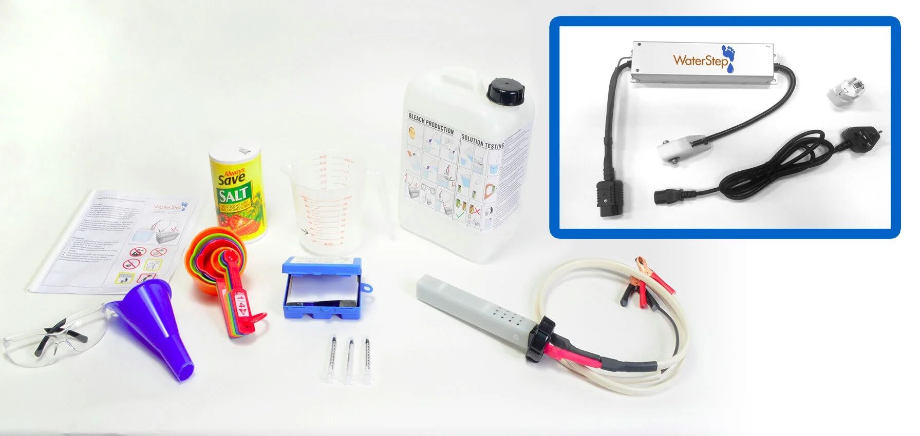 WaterStep M-100 Chlorine Generator helps make existing water supplies safe to drink. Using a 12-volt car battery and salt, the M-100 Chlorine Generator simply and safely produces chlorine gas that is injected into the water to kill waterborne pathogens.